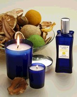 A flame inside a beautiful cobalt glass on my dresser unleashes not only a blue tinged soft light, but also a wonderful scent. The fragrance is tart and crisp with enough sweetness to lend a nice balance and to meld all the notes together. One moment, it is a plate laden with grapefruit slices sprinkled with sugar and lemony coriander seeds; the next, it is a bouquet of garden herbs about to be chopped in the course of dinner preparations.
