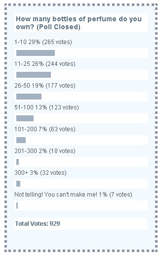 I'm impressed by the number of respondents who own 300-plus full-size bottles of fragrance!!! Makes my stash of half that number seem almost. . .inadequate!! (any excuse to buy more. . .!)