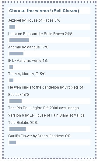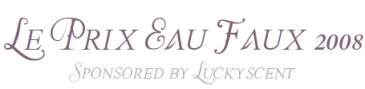Here they are, the finalists for the 2008 Prix Eau Faux, our contest to honor creative fragrance writing or "faux ad copy" (you can read about the contest here). Thank you again to everyone who took the time to enter! We had 55 entries, and the judges (me, Angela, Kevin, Erin and Jessica from Now Smell This, Marina from Perfume Smellin' Things and Katie from Scentzilla) have whittled it down to 8 finalists.