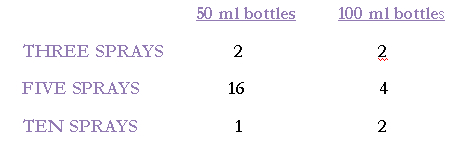 To start, I used three empty 50 ml perfume bottles, by three different perfume companies, and filled the bottles with water and sprayed till they were empty. The average number of sprays in a 50 ml bottle is 735 (double that figure for a 100 ml bottle of fragrance). We all know there are 365 days in a year, so a 50 ml bottle of fragrance will provide a person (who wears that fragrance every day and sprays once) TWO years worth of perfume. Of course, most of us wear more than one spray of scent; if you wear two sprays a day, every day, from a 50 ml bottle of perfume, that single bottle will last a year.