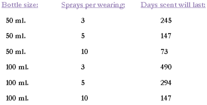 WOW!!!! That's incredible! Thank you so much for breaking this down. I had no idea how many sprays I'd get with one bottle. The number is astounding! The thing that strikes me most – for the amount of enjoyment that perfume provides, it's really a cheap form of entertainment. If a 50ml bottle provides you with 5 sprays for each of 147 days, what's the cost per wearing? An average 50ml bottle probably costs about $60, so that's about .41 per 5-sprays. Not a bad deal!