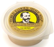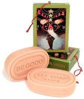 And the stocking stuffers: at left, Swedish Elf Soaps for children. "Sure to delight children and adults alike, the Swedish Elf Soaps are just the right size for little hands. Scented with spice and stamped with an elf message to Be Good or Be Nice, they're presented in vintage art ornament boxes to hang on the tree or anywhere." $4.50 each at eBubbles. At right, Col. Ichabod Conk Shaving soap, with aloe vera and avocado. Available in Almond (shown), lime, amber or bay rum, $3.50 for small or $5.50 for large at Lee's Safety Razors.