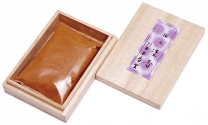 You can certainly use today's review subjects in meditation or religious practice, but they're great as perfume alternatives, for days when you want something interesting, but subtle. Before the reviews, some notes: incense powders are brown colored because of spices (clove, cinnamon, etc.); I wouldn't recommend lavish use of these powders when you wear your favorite white shirt. Incense powders used in small quantity and rubbed into skin should pose no staining problem, but do think of using them in places where contact with textiles is minimal: ear lobes and the area on your neck right beneath your ears; wrists; and forearms (on short-sleeve or no-sleeve days). In warm weather when you're wearing shorts, put some incense powder on your legs and sandal-clad, or bare, feet. You can also, especially if you like clay/dry hair pomades that produce a matte finish, sprinkle a small amount of powdered incense on your comb or hair brush and scent your hair. What I'm saying is: use your incense powder; it doesn't last. I have boxes of incense from Japan that are 18 years old and still smell wonderful when I burn some; the powdered nature of zu-koh means the scent will not last so long (use your powder within a year and store it in an airtight container).