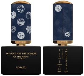My Love Has the Colour of the Night (shown above, front and back, and below in box) ~ developed by perfumer Sophie Labbé. "My Love Has The Colour Of The Night / A Firefly /In The Swimming Pool’s Light." With gaiac, patchouli and vetiver.
