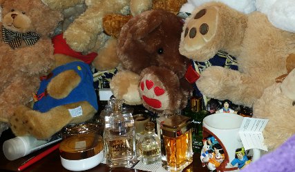 For storage, instead of shutting her perfume away in a cabinet, she keeps it out of light by heaping teddy bears on her bottles (see below). “I like teddy bears, and my sons give them to me.” (Her sons enjoy their own fragrances, Batman and Spiderman colognes. Batman is “quite nice — musky, earthy, and fresh. Spiderman is icy, watery.”)