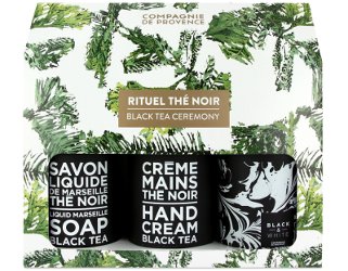 From Compagnie de Provence, a Black Tea Ceremony gift set, with 300 ml liquid Marseille soap, 300 ml hand cream and 180g candle, all scented with black tea and blackberry. €54 at Compagnie de Provence. (I could not find this gift set in the US, but you can find all the separate components at Amazon.)