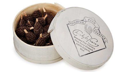 From Uncommon Goods, Pine Cone Scented Firestarters ("These all natural firestarters are the perfect housewarming gift in more ways than one. Whether you're starting up the grill or hearth, the organic beeswax and essential oil pine cones bring a deliciously evergreen scent to your homestead and come packaged in a rustic wooden box. Handmade by Christophe Pourny in Brooklyn, New York.") $50.