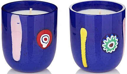 From Frédéric Malle's limited edition Laguna B candle collection, featuring "a beautiful Murano glass vessel painted with a multicolored abstract design and showcasing fine Venetian craftsmanship", the Russian Nights candle with fragrance by Sophia Grojsman ("A night at Café Pushkin, where rich spice cake is served with black tea from a silver samovar. Outside, snow coats the streets and candied spires of Saint Basil’s cathedral, and a babushka’s impassioned song travels in the wind. Nutmeg, cinnamon, iris and sandalwood, for northern frosty nights.") $200 at Barneys.