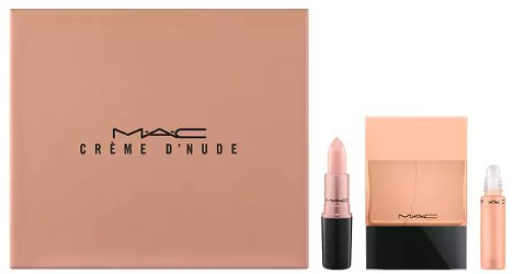 From MAC, a Shadescents kit in Crème d'Nude, with Crème d'Nude Cremesheen Lipstick, and 6 and 50 ml sizes of the matching Eau de Parfum ("Crème d'Nude captures a vibrant sexiness through a cocoon vibrant musk." $57.