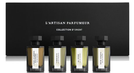 From L'Artisan Parfumeur, the Collection d'Orient, with 5 ml mini bottles of Timbuktu, Noir Exquis, Al Oudh and L'Eau d'Ambre Extrême. $55 at Arielle Shoshana.