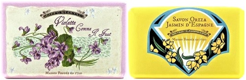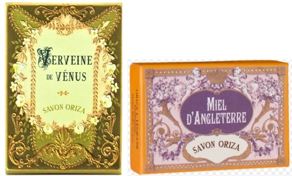Each Oriza soap comes in a beautifully decorated box with a mini-business postcard inside (I use them as scented bookmarks). Savon Oriza not only scents skin, but the bathroom environment, too (and the drawers where I store soaps before use); these soaps produce abundant creamy lather, and there's LOTS of perfume in the formulas.