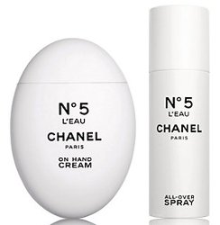 Fans of Chanel No. 5 L'Eau might need one or both: On Hand Cream ("This limited-edition cream is a novel, sensual way to nourish and delicately scent the hands and body.", $55 for 50 ml) or All-Over Spray ("A generous and portable scented spray to use anytime of day to refresh and lightly revive the notes of the modern scent.", $60 for 150 ml). At Saks Fifth Avenue (and other stores as well).