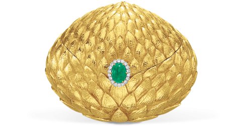 Note: top image shows an emerald, diamond and gold evening box by David Webb ("Designed as a sculpted 18k gold artichoke, the clasp set with a cabochon emerald trimmed with circular-cut diamonds, opening to reveal a single compartment with a mirrored lid, mounted in platinum and 18k gold") that went for $116,500 at the Collection of Elizabeth Taylor: Jewelry (II) auction at Christie's in 2011.