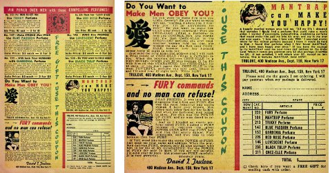 David J. Trulove is the purported head of Trulove Perfume. Trulove perfume ads peppered comic books in the 1950s. Like many ads for fragrance today, they promise seduction and, curiously, bypass what the perfume actually smells like. But Mr. Trulove doesn’t mess around with fancy models in diaphonous gowns and vague references to the modern woman. No, he goes right to the meat: love and power.