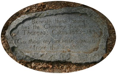 Note: top image is 050506 Walden Pond_008 [cropped] by Tom Stohlman at flickr; some rights reserved. The stone plaque is at Walden, and says Beneath these Stones lies the Chimney Foundation of Thoreau's Cabin 1845-1847 "Go thou my incense upward from this hearth"; the quote is taken from Thoreau's poem Smoke.