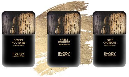 Evody Cité Orinique, Désert Nocturne and Sable Pourpre are available in 30 ml Extrait de Parfum.