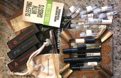 Nancy owns a handful of bottles of perfume, but most of her collection these days is in decants and samples. She balked at taking photos of her collection, saying they are in a dark, boring cabinet. I assured her that’s how most of us store our perfume. Look closely, and you’ll see the bottle of patchouli oil.