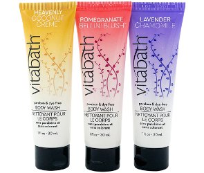 A TSA friendly set of 30 ml Body Washes from Vitabath, in Pomegranate Bellini Blush, Lavender Chamomile and Heavenly Coconut Creme. $4.95 at Vitabath, where you'll find the same trio in Body Cream, same price.