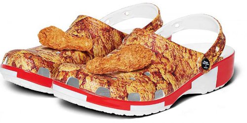 I posted a link to these on Twitter yesterday, but here's a better shot: the KFC fried chicken Crocs, complete with (removable) fried chicken scented "Jibbitz" (those embellishment thingies that look like drumsticks). They go on sale Tuesday at the Crocs site, and are bound to sell out immediately. $59.99, with $3 going to the REACH Educational Grant Program. (via mashed, eater) More scented shoes here, here and here.