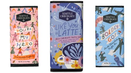 Valentine's Day is coming up! Here are 3 chocolate truffle bars from Seattle Chocolate. You're My Hero ("...with crunchy toffee pieces and Pacific sea salt in dark chocolate to celebrate your heroes, both big and small. 5% of net profits go to Mary’s Place"), Like You Latte ("creamy milk chocolate truffle bar infused with decaf espresso and crunchy, sparkling demerara sugar") and Boldly Go ("dark chocolate bar enrobes a creamy milk chocolate truffle center with caramel flavor notes"). 70g each (yes, they're all the same size! not shown to scale!) for $4.75 at Seattle Chocolate.