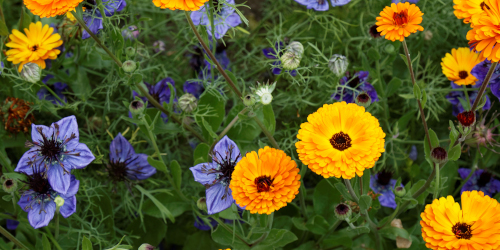 Note: top image is detail from 'Calendula officinalis' and 'Nigella hispanica' in Walled Garden of Goodnestone Park Kent England via Wikimedia Commons.