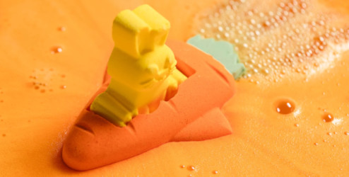Note: The Flying Carrot bath bomb ("Settle in for an uplifting and fruity ride with brightening carrot powder, uplifting lemon myrtle, and cleansing rosewood. Let this adventurous rabbit take flight and fizz around your tub in enchanting hues of orange") is $9.95 at Lush USA.