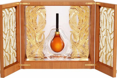 Lalique Fusion is €25,000 for 20 ml. The outer box features a cherry wood veneer with gilded brass plates.