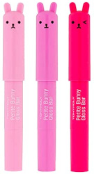 Petit Bunny Gloss Bars ("With a smooth texture that falls somewhere between a lipstick and a lip gloss, this adorable lip crayon is packed with Vitamin E to soften and moisturize lips. Each gloss bar has a different fruity scent and shade, giving lips a natural, sheer color with a high shine glossy finish. This seriously adorable gloss bar can be worn alone or over a tint to add a little extra shine!") come in six colors. They're $8 each for 2g at TonyMoly.