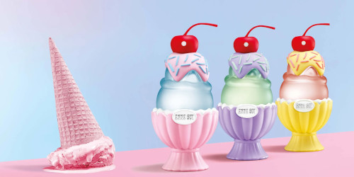 Mellow Yellow ~ "The Mellow Yellow eau de toilette is perfect for the laidback girl and is scooped into a never before seen ice cream sundae bottle with the perfect spray through cherry on top. Cool yourself off with laidback Mellow Yellow. Irresistibly sweet sugared lemon and passionfruit pulp play with bright osmanthus, jasmine and creamy vanilla to illuminate your senses." The watery fruity floral was developed by perfumer Christine Hassan; additional notes include peach, crabapple blossom, plum wood and musk.
