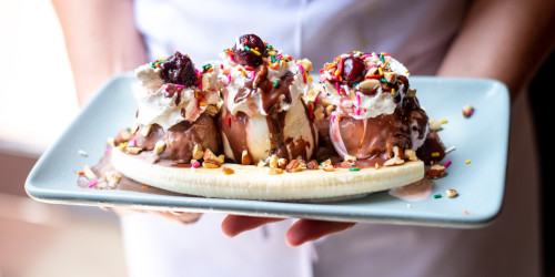 Note: top image of a banana split via McConnell's Fine Ice Creams at Facebook.
