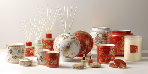From the Oriente Italiano collection at Ginori 1735, (pretty but spendy) home fragrances for Holiday 2023: "Two new fragrances explore new olfactory universes: Cuoio Rosso, with its fruity-woody notes, emanates a vibrant energy in the room. Vicolo Dell'Oro, with refreshing floral and musky notes, to accompany moments of pleasant relaxation." Neiman Marcus has a bunch of the items for pre-order, including the candles in 250g ($210) and 700g ($420), the candle vase (right rear, $880) and its refill (far right, 1520g, $190), the diffuser in 200 ml ($180) or 500 ml ($270), and the diffuser vase (shown above center, $1350). Also shown are the two scented stone boxes (which appear to be sold separately from the actual stones with diffuser oil) those are not at Neiman Marcus as of yet.