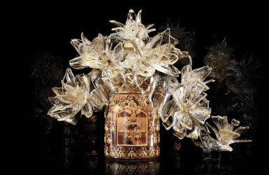 An(other) extravaganza from Guerlain to honor the 170th birthday of the bee bottle: Bouquet de la Mariée in the Murano edition from glassmaker Aristide Najean. The flacon “incorporates sculptural flowers flecked with 24-karat gold, delicately arranged to appear as though they are pouring out of the flacon; like with the original iteration, golden bees adorn the exterior. The center of the bottle displays the date April 30, 1853 — the day the bee bottle was born”.
