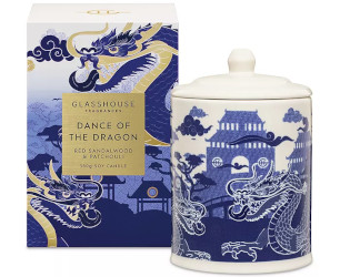 From Glasshouse, the Dance of the Dragon candle: "An extra flicker seems to happen when it's lit, like you've unleashed the majesty of the creature itself. The blend of Champaca, Sandalwood, and Amber surge together to erase the past and make you reborn with power. This is the Dance of the Dragon." $55 for 380g at CO Bigelow.