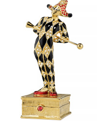 A lemming for fans of Estee Lauder's solid perfume compacts: five new designs. "Whimsy meets exuberance. Fantastical, unexpected combinations. Decadent treats. Sweet aromas. Over the top luxury. All waiting for you to indulge. A collection that delights in extravagance. Intricately designed by luxury jewelry designer and storyteller Monica Rich Kosann." Hat Treat (above far left, Beautiful Magnolia, "Have fun being completely over the top with a hat topped with cake and a moving hummingbird"); Elegant Swim (above second from left, Beautiful Magnolia, "This graceful swan in a glass of champagne reminds us to not take ourselves to seriously, but always enjoy life’s simple pleasures. You'll especially love the charming details, such as the swan’s pearl necklace"); Treat Yourself (above third from left and far right, Pleasures, "Hold on to your childish innocence with this delectable compact. It evokes memories of a long summer day, chasing butterflies and eating ice cream"); Dessert First (fourth from left, Pleasures, "This pretty cake on top of a cake stand reminds us that having dessert first is always a good idea") and Jester (shown below, Beautiful, "This whimsical solid perfume compact is the perfect edition to the holidays"). $300 each at Estee Lauder.