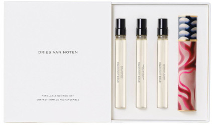 Coming soon from Dries van Noten, travel trios with cases and 10 ml refillable bottles. Shown is the floral set, with Soie Malaqué, Fleur du Mal and Vanille Camouflage. (The woody set has Rock the Myrrh, Cannabis Patchouli* and Crazy Basil.) Sorry I do not know the price, but the trios without the case are €105. *Called Bois Défende in some markets.
