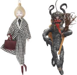 An offtopic lemming passed on by reader nozknoz: unusual Christmas tree ornaments from Choosing Keeping in Covent Garden. Shown is the Halloween Cat Cotton Doll Ornament ("These Spun Cotton Dolls are faithful replicas of ornaments from a bygone era - originating in 19th and early 20th century Germany") and it is spendy at £116.67, but there are many glass ornaments that are more reasonably priced. My favorite is the also-spendy Houndstooth Suit Lady Ornament (£70, shown below left and just waiting to be sprayed with Diorissimo) and nozknoz likes the Grampus (£112, shown below right). At Choosing Keeping, where you'll also find an amazing assortment of food-shaped candles (unscented, I think) and the Cat Christmas Garland (£9.33, shown at bottom). If you have a favorite store for unusual ornaments, do comment!