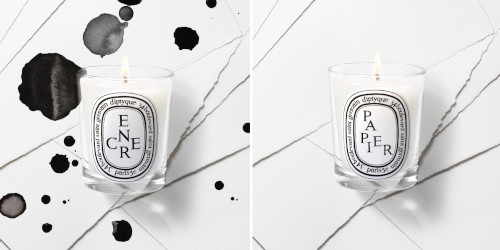 From Diptyque's new L'Eau Papier collection, limited edition candles in Papier ("velvety musks mingle with sesame and heliotrope in an ode to this much-loved material") and Encre ("depth of patchouli meets the dense texture of black liquorice in an evocation of ink"). $74 each for 190g.