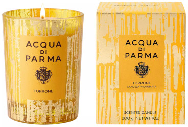 From Acqua di Parma's holiday collection for 2025, the Torrone candle: "Fill your home with cozy warmth using this Torrone candle from ACQUA DI PARMA, inspired by the golden sweetness of Italian winter treats. The scent features toasted sugar and honeyed almonds for a comforting gourmand atmosphere. Its festive motif in brushed gold tones adds a decorative touch." 200g for $115 (or use code FRIEND at Macy's for 15% off).