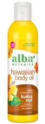 From Alba Botanica, Hawaiian Deep Moisturizing body oil in Kukui Nut: "Find sweet satisfaction with this nutrient-rich, super-smoothing, fast-absorbing body oil. Made with a blend of kukui nut, sweet almond, coconut, flaxseed and sunflower oils, this body oil works its magic to nourish, hydrate and protect skin from moisture loss. Skin is doused in silky perfection." Reviews on the smell range from yum to sticky sweet, so perhaps give it a sniff first? About $7 for 250 ml at Vitacost.