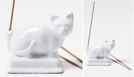 With sincere apologies to those of you who are sick of the whole subject, yet another Astier de Villatte kitty incense holder, this one much simpler and cheaper (albeit still no bargain). The Minou Cat Incense Holder in glazed terracotta is $145 at Santa Fe Dry Goods.
