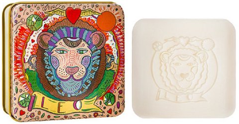 Leo ("warm, sunny spice") from the Savon Zodiaque Collection at Pré de Provence, in tins by illustrator Leslie Cober-Gentry. About $10 at Amazon.