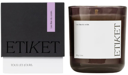 From Etiket in Canada, the Les Lilas du Voisin candle: "When you take your morning walk, you always turn left. Maybe it’s habit, or maybe it’s the avalanche of lilacs erupting from your neighbour’s yard, pulling you eternally in that direction. This is the smell of the few blossoms you steal from those branches, glancing furtively at their front window before dashing away. With notes of lilac, airy muguet, and a touch of freshly tilled garden soil, light this candle to feel like a kid again. Walk fast and inhale greedily." $68 for 350g.