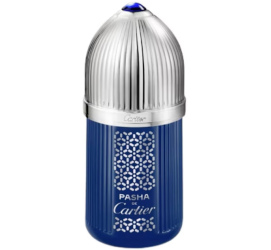 Pasha de Cartier Parfum in a refillable limited edition collector bottle: "Pasha de Cartier Parfum is magnified in a limited-edition bottle, which reinterprets the signature deep blue of the cabochon that adorns the Pasha de Cartier watchmaking icon. Inspired by the Cartier archives, silver arabesque motifs introduce a visual game of contrasts and play with reflections of light." $138 for 100 ml at Cartier USA.
