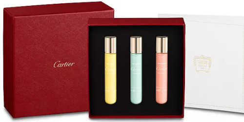 From Cartier, a Les Rivières de Cartier discovery set: "Insouciance, Allégresse, Luxuriance: three rivers, three intense emotions that immerse you in nature, celebrating life. These clean scents pay homage to nature with a fully responsible approach, from the bottle to the formula." 3 x 10 ml, $68 at Bloomingdales.