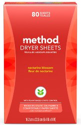 New-ish from Method: dryer sheets in Nectarine Blossom. "are your clothes getting too clingy? we hate when that happens, too. take control with our new dryer sheets. made from 100% compostable paper, our planet-friendly dryer sheets reduce static and soften your fabrics. plus, they make clothes smell delightful. triple win." $5 for 80 at Target, where they've also got the matching laundry detergent.