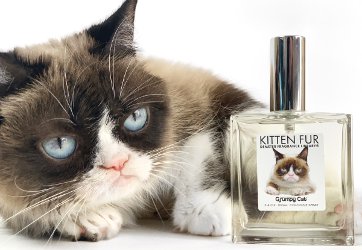 A collector bottle for Grumpy Cat fans: Demeter Kitten Fur in limited edition packaging featuring Tardar Sauce. Per Demeter, this is "the first cross species limited edition celebrity collaboration". In 30 ($23) or 100 ($40) ml Cologne Spray or in a 10 ml Roll On Perfume Oil ($12).