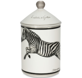 Zebra! From Dolce & Gabbana, the Litchi & Gelso candle. "From the Zebra Collection. Dolce&Gabbana Casa presents a line of scented candles that offer authentic high-quality aromatic harmonies. This candle takes one on a sensorial journey through memories and sensations, with a sweet and fruity fragrance of lychee, mulberry, and delicate tropical tiaré blossoms. The porcelain container, adorned with hand-painted silver detailing, represents the duality at the heart of Dolce&Gabbana's DNA, blending past and future, tradition and innovation." 340g for $415 (ouch) at Saks.