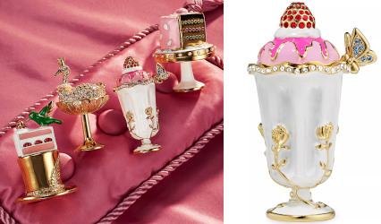 A lemming for fans of Estee Lauder’s solid perfume compacts: five new designs. “Whimsy meets exuberance. Fantastical, unexpected combinations. Decadent treats. Sweet aromas. Over the top luxury. All waiting for you to indulge. A collection that delights in extravagance. Intricately designed by luxury jewelry designer and storyteller Monica Rich Kosann.” Hat Treat (above far left, Beautiful Magnolia, “Have fun being completely over the top with a hat topped with cake and a moving hummingbird”); Elegant Swim (above second from left, Beautiful Magnolia, “This graceful swan in a glass of champagne reminds us to not take ourselves to seriously, but always enjoy life’s simple pleasures. You’ll especially love the charming details, such as the swan’s pearl necklace”)…