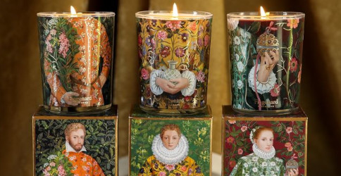 From Fragonard, a limited edition holiday collection decorated by British artist Lizzie Riches and intended as a tribute to 16th century English painting and gardens. Shown are the three candles: Bois Dormant (above left; "Like a bonfire, this candle's flame dances cheerily in its exquisite jar and fills the house with a woody fragrance"), Cette Nuit Là (above center; "...fills the night with a welcoming fragrance redolent of pine needles") and Orangette (above right; "Cinnamon has been blended with orange to create a candle with sweet notes evoking the festive period"). €31 each for 200g.