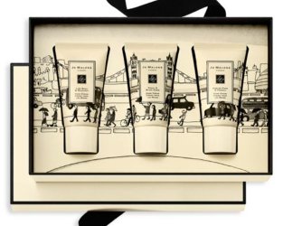 Tempting packaging from Jo Malone, again: "A luxurious miniature Hand Cream Collection. Encased in exclusive, London-inspired designs. Hand-illustrated by celebrated British artist Helen Beard. Infused with our most-loved scents. Tantalizing Lime Basil & Mandarin. Mellow English Pear & Freesia. Opulent Peony & Blush Suede. Lightweight. Easily absorbed. With apricot kernel oil to help nourish and protect. Drenching hands in moisture." Three 30 ml hand creams for $60 at Saks Fifth Avenue.